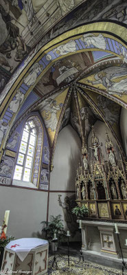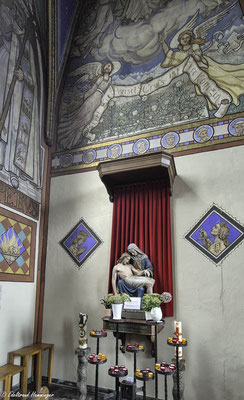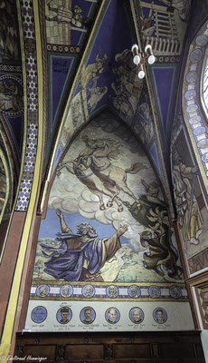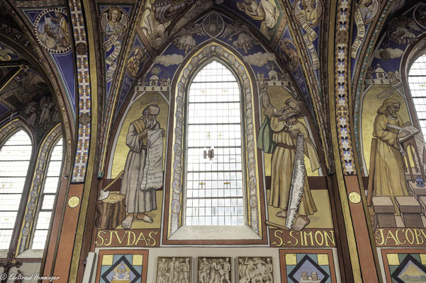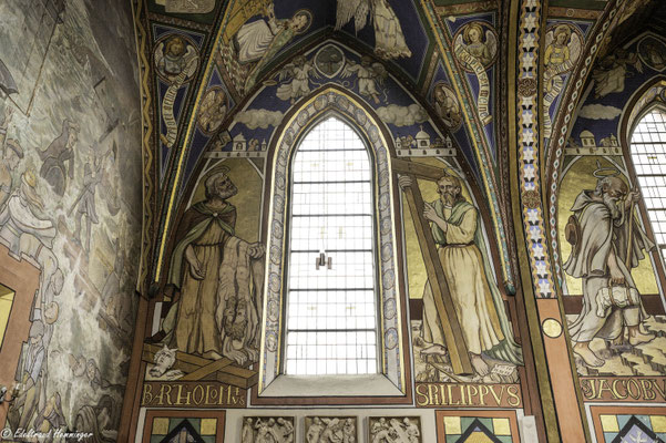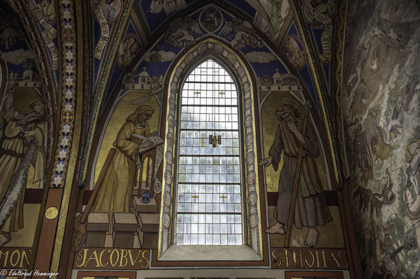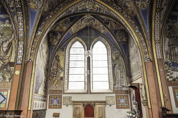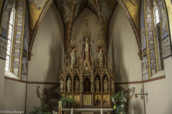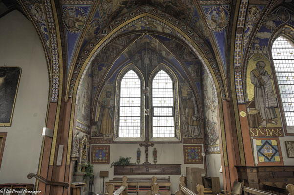 Eines zeigt die Ausmalung jedoch nicht: ein Kreuzigungsmotiv. Stattdessen hängt über dem Eingang zur Sakristei ein Ölgemälde aus der flämischen Van-Dyck-Malerschule. Pfarrer März kaufte das Bild aus eigenen Mitteln. Er wollte es offenbar nicht selber malerisch kommentieren.