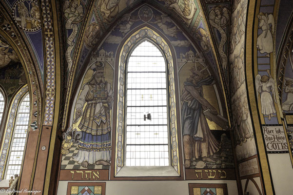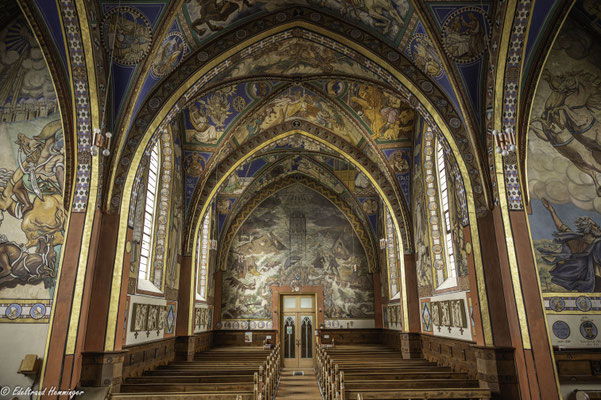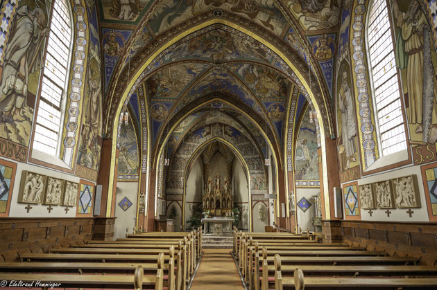 Pastor Christoph März hat von 1906 bis 1921 die Kirche mit Motiven des Alten Testaments und Neuen Testaments sowie aus der Kirchengeschichte, bestehend aus über 1.000 Figuren und 150 Tieren, eigenhändig ausgemalt. Für einige Figuren standen ihm Einwohner Modell. Die Gemälde bedecken jeweils die maximale Grundfläche der betreffenden Bauteile. Auffallend ist die wiederkehrende Verwendung von intensivem Blau und strahlendem Gold als Symbolfarben. Auch die Abbilder sämtlicher Päpste und vieler Kirchenmänner wurden an den Wänden verewigt.
